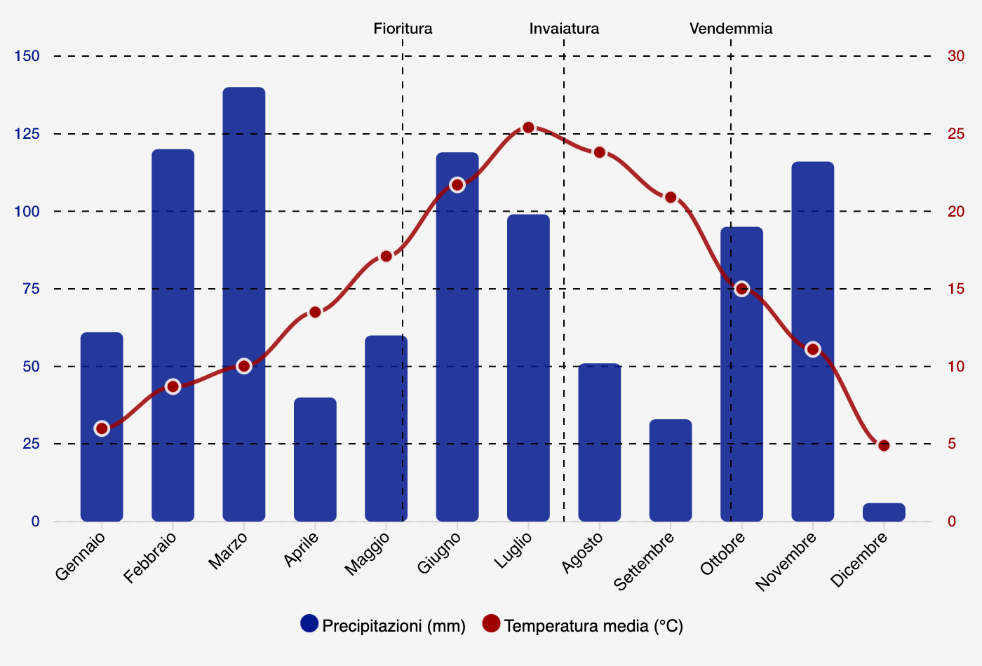 Grafico precipitazioni e temperature + fioritura, invaiatura, vendemmia