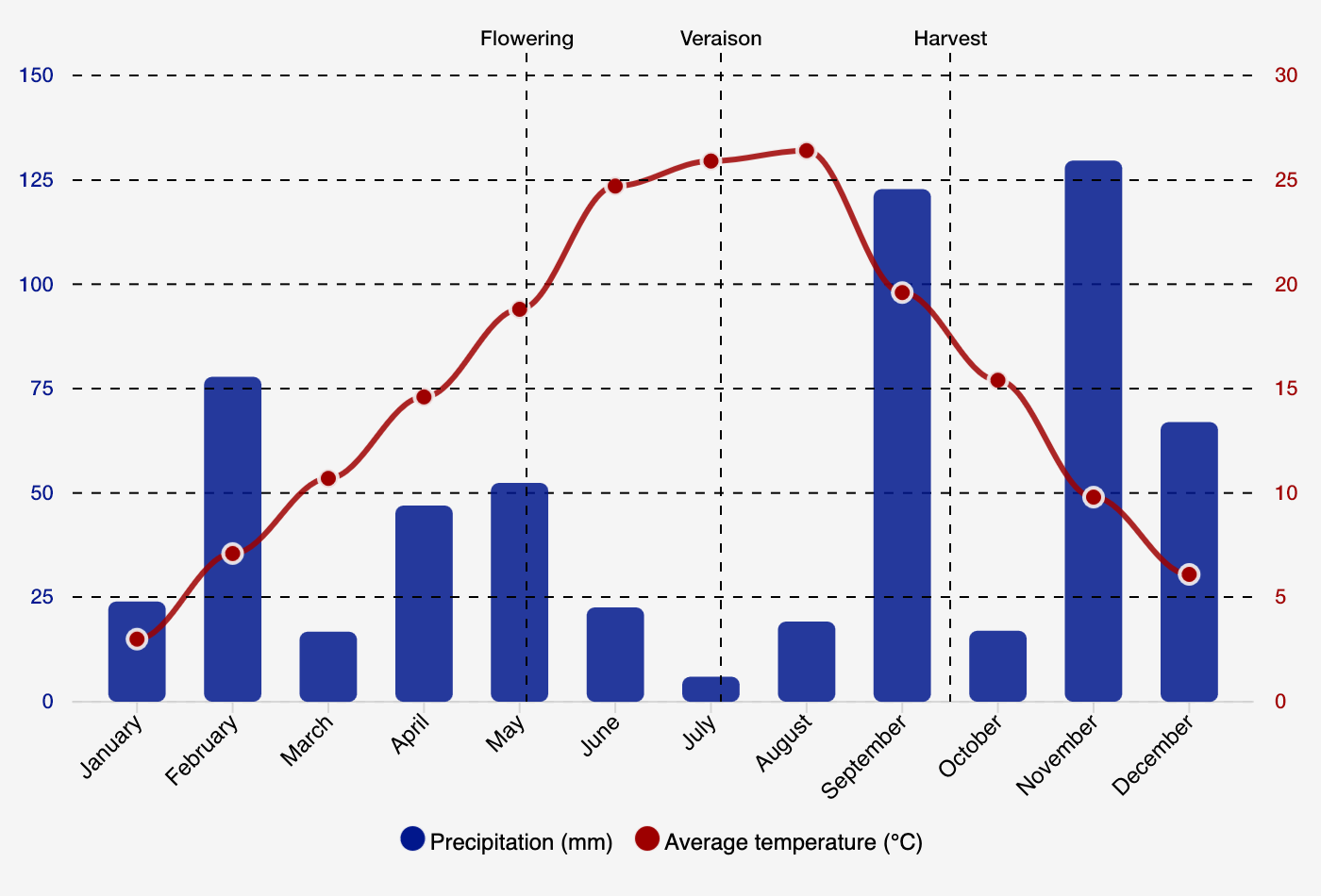 Precipitation and temperature graph + flowering, veraison, harvest